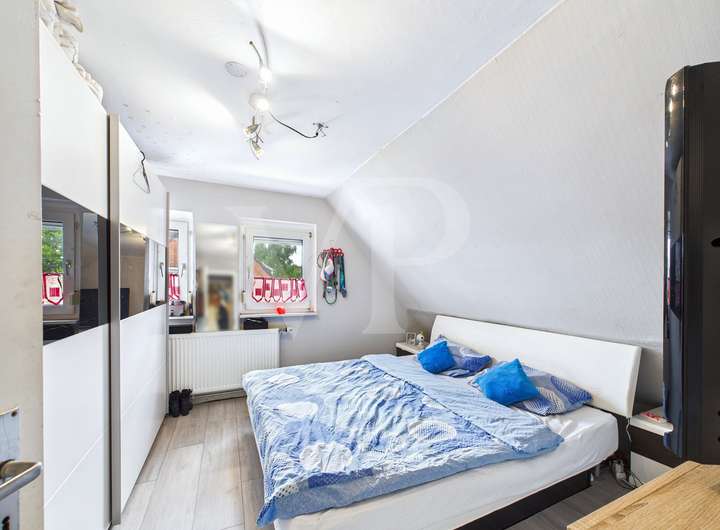 Im Obergeschoss befinden sich drei flexibel nutzbare Zimmer, die sich ideal als Schlaf-, Gäste- oder Arbeitszimmer eignen. Das Obergeschoss weist Renovierungsbedarf auf – so sollten unter anderem teilweise die Fenster, Bodenbeläge sowie einige Innentüren erneuert werden.