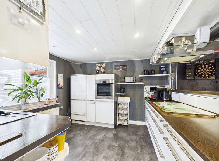 Eine angrenzende, separate Waschküche erhöht den Alltagskomfort zusätzlich. Ein Teilkeller bietet zusätzlichen Stauraum für Vorräte oder saisonale Gegenstände.