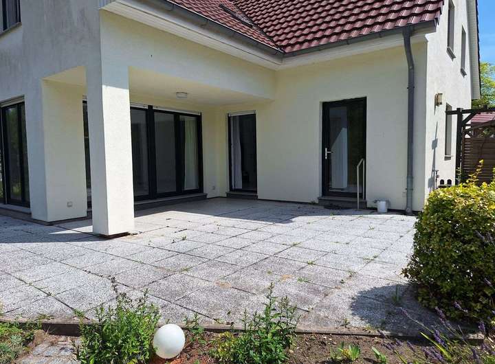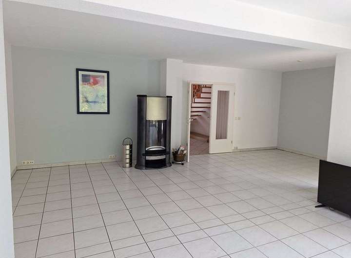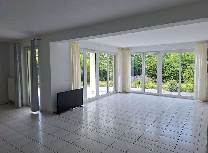 Im Erdgeschoss befinden sich ein großes Wohn- und Esszimmer mit Kamin und breiter Fensterfront Richtung Garten, eine Küche mit einer Einbauküche (unentgeltlich), zwei Hauswirtschaftsräume, ein Gäste-Bad mit Dusche und ein Flur. Vom Wohnzimmer aus gelangt man auf die Süd-West-Terrasse.