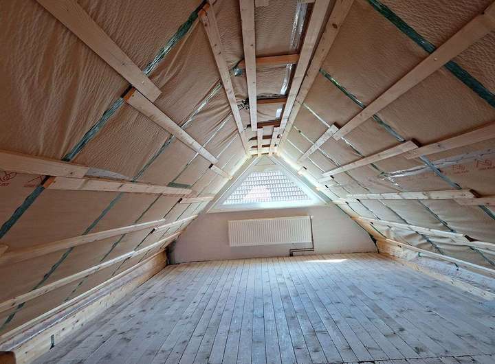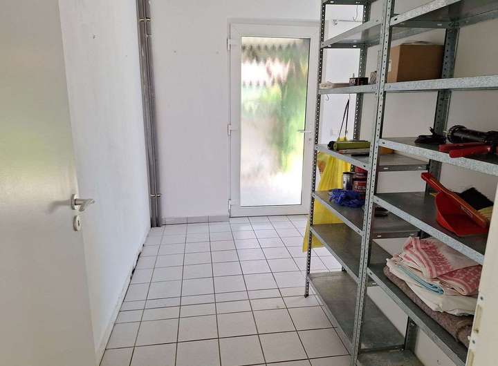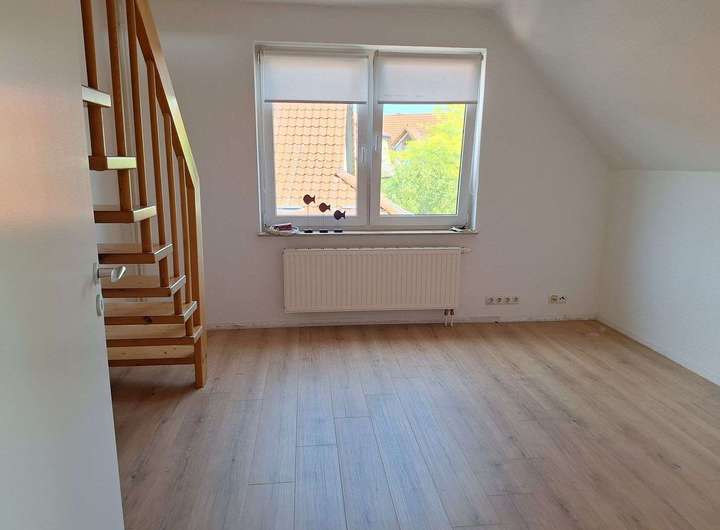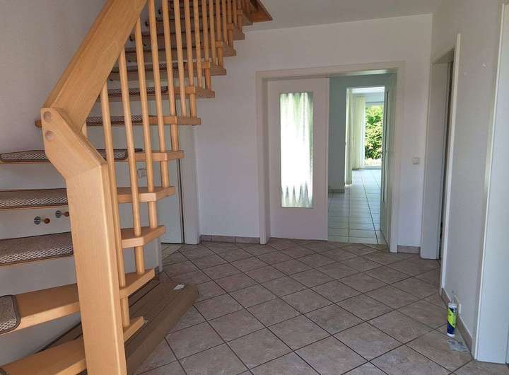 Die Räume im Erdgeschoss sind mit Fliesen ausgestattet; das Dachgeschoss hat einen Laminatboden. Bäder sind gefliest.