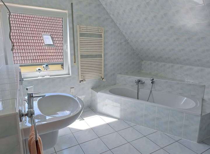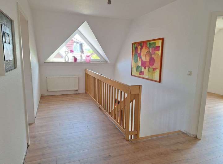 Im Dachgeschoss sind vier weitere Wohn-/ Schlafzimmer (eines als Durchgangszimmer), das große Bad mit Dusche, Wanne und Fenster, ein weiterer Abstellraum und ein Flur angeordnet.