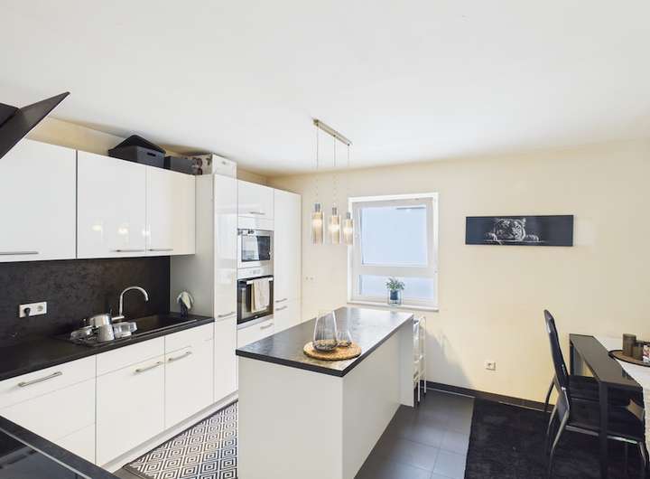 Das Herzstück der Wohnung bildet der großzügig gestaltete Wohn- und Essbereich. Ein geschickt platzierter Holzofen agiert als stimmungsvolle Alternative zur Gastherme und bildet gleichzeitig den perfekten Rahmen für gesellige Mahlzeiten oder beschauliche Stunden mit einem guten Buch bei prasselndem Feuer.