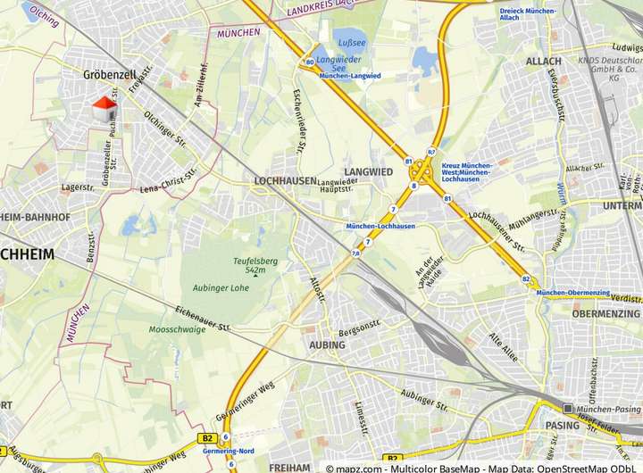 Gröbenzell liegt unmittelbar am Autobahnkreuz A96/A99 sowie der A8, von wo Sie zum einen schnell an berühmten Ausflugszielen im Fünfseenland sind, zum anderen erreichen Sie in wenigen Minuten das Stadtzentrum von München.