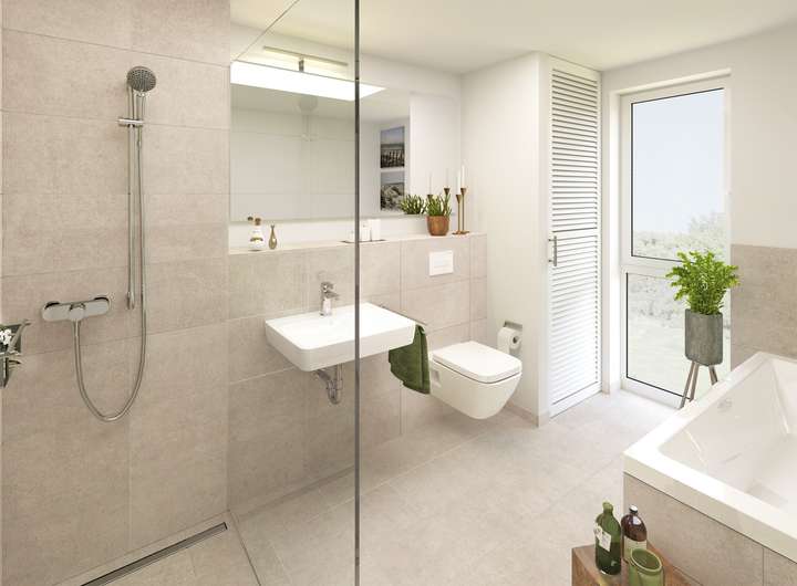 - Großzügiges Badezimmer in Markenqualität mit bodengleicher, gefliester Dusche und Badewanne