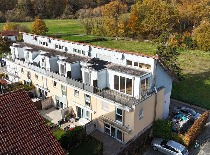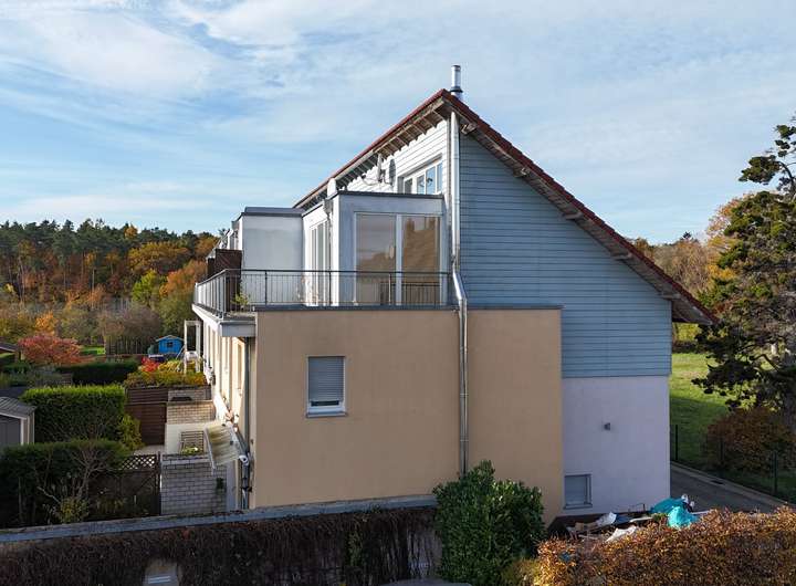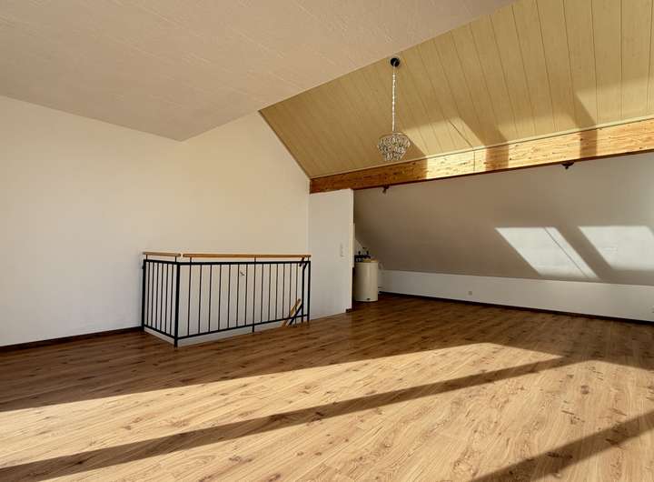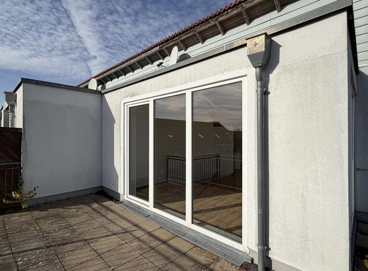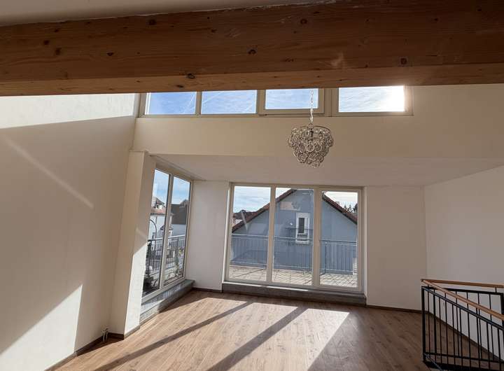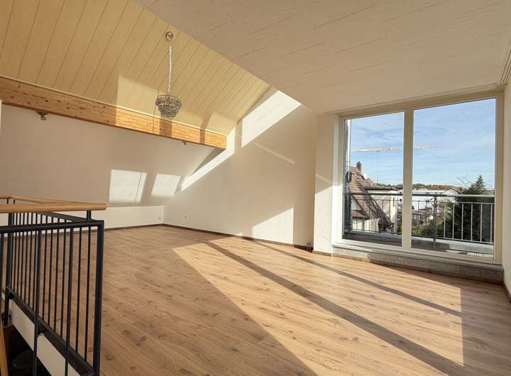 Ein echtes Highlight ist das Dachgeschoss: Ein großzügiges, offenes Studio mit einer beeindruckenden Deckenhöhe von bis zu 5 Metern und fast vollständig verglaster Front. Von hier aus betreten Sie die etwa 20 m² große Dachterrasse – ein traumhafter Rückzugsort für sonnige Stunden mit Weitblick.