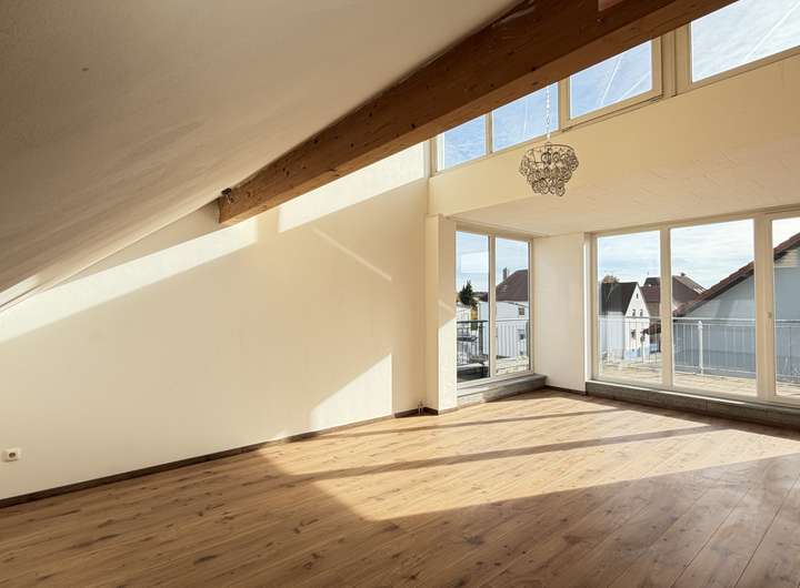 Studio (Dachgeschoss): edler Parkettboden, beeindruckende Fensterfronten und Zugang zur ca. 20 m² großen Dachterrasse