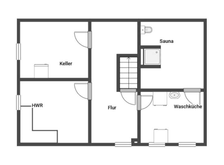 Das Kellergeschoss verfügt über ca. 70 qm Nutzfläche. Diese verteilt sich auf den Hauswirtschaftsraum, die Waschküche, einen Vorratsraum sowie auf einen Raum mit Sauna und Dusche.
