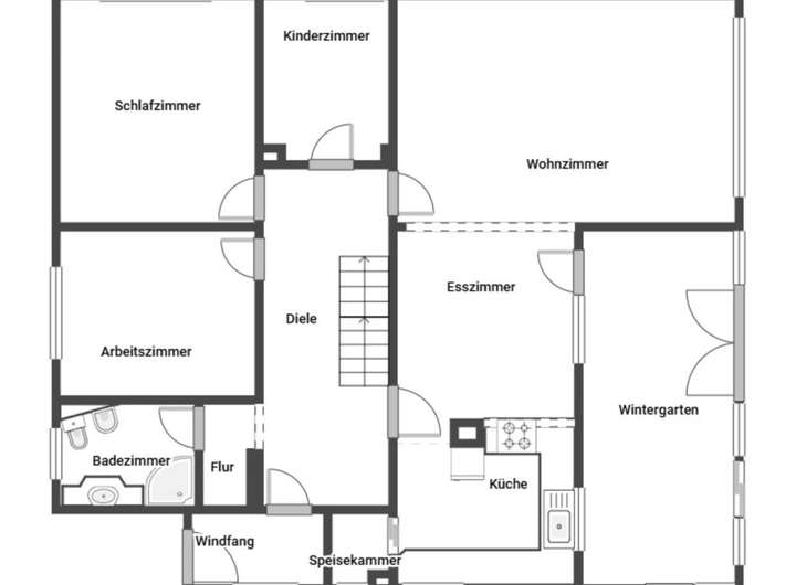 Das Herzstück des Hauses bildet der offene Wohn- und Essbereich mit hochwertiger Einbauküche und direktem Zugang zum lichtdurchfluteten Wintergarten. Ein gemütlicher Kaminofen sorgt im Wohnzimmer für ein behagliches Wohngefühl in der kühleren Jahreszeit.
