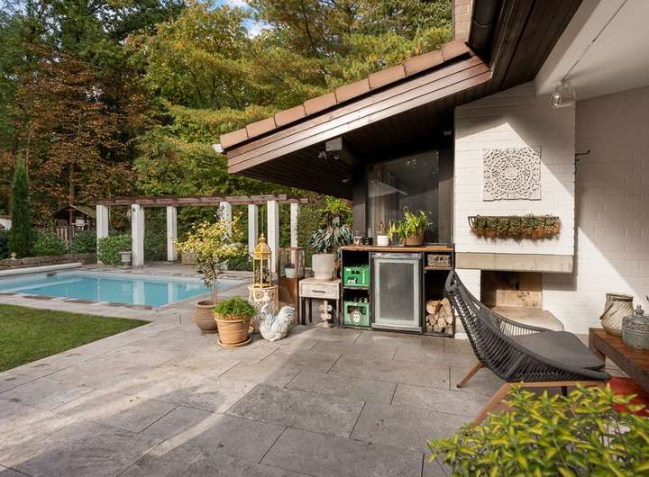 Der Garten bildet das Herzstück des Anwesens. 2012 wurde er neu angelegt und präsentiert sich heute in einem gepflegten, eingewachsenen Zustand. Der beheizbare Pool (7 m x 3,25 m) aus dem Jahr 2014 ist ganzjährig nutzbar und bildet zusammen mit der 2016 neu gestalteten Terrasse das Zentrum für Freizeit und Erholung. Mehrere Ebenen bieten Platz zum Sonnen, Entspannen und Verweilen. Über einen kleinen Weg erreichen Sie den privaten Zugang in den angrenzenden Wald, der dieses Grundstück zu einem besonderen Rückzugsort macht.