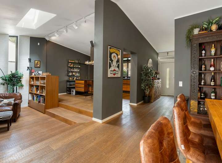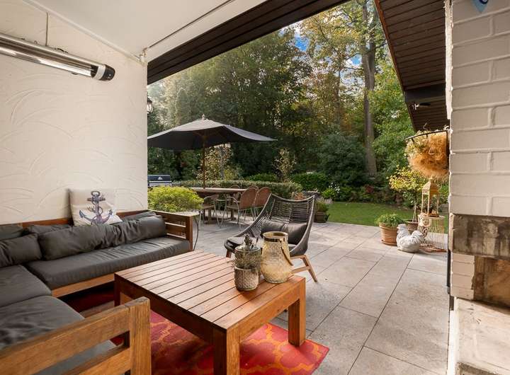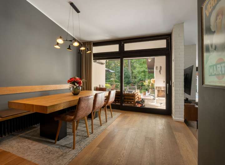 Die offene Gestaltung schafft ein harmonisches Raumgefühl. Der Essplatz liegt zentral zwischen Küche und Wohnzimmer. Große Fensterfronten lassen viel Licht herein und öffnen den Blick in den Garten. Der Innenkamin bildet den Mittelpunkt des Raumes und sorgt in den Wintermonaten für angenehme Wärme. Auf der angrenzenden, überdachten Terrasse befindet sich ein zweiter Kamin, der den Außenbereich zu einem echten Wohnraum im Freien macht.