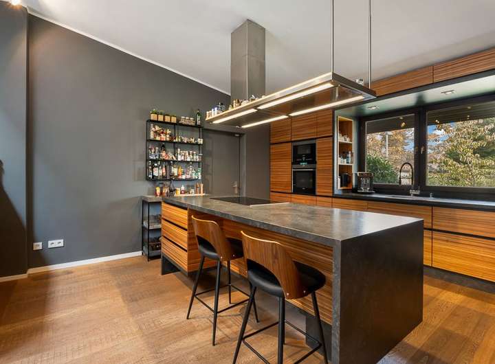 Die Küche wurde individuell vom Schreiner gefertigt. Hochwertige Materialien, präzise Verarbeitung und eine durchdachte Aufteilung schaffen einen funktionalen und zugleich ästhetischen Mittelpunkt. Der Blick reicht von der Küche über den Essbereich bis hinaus in den Garten.