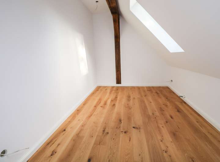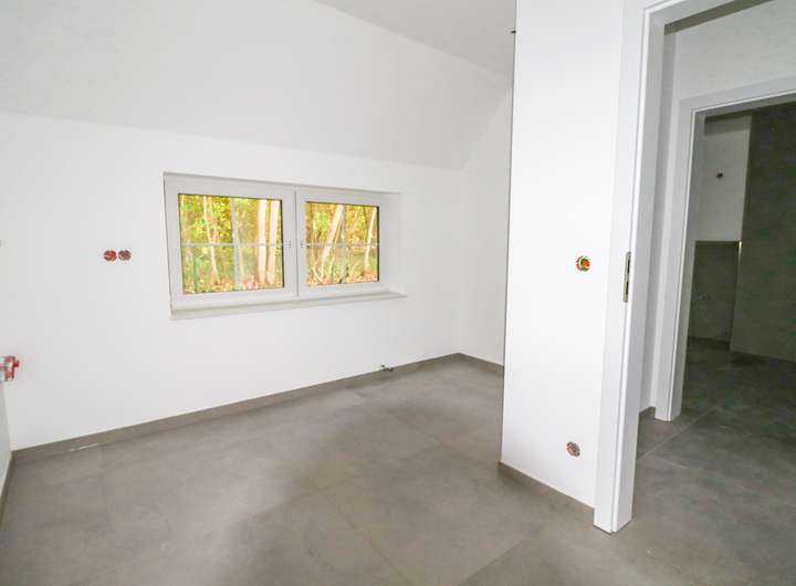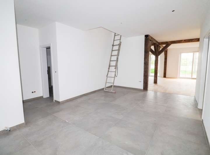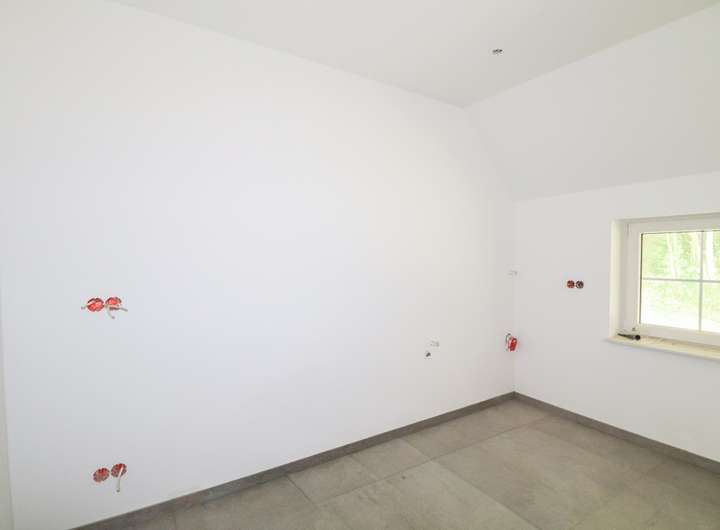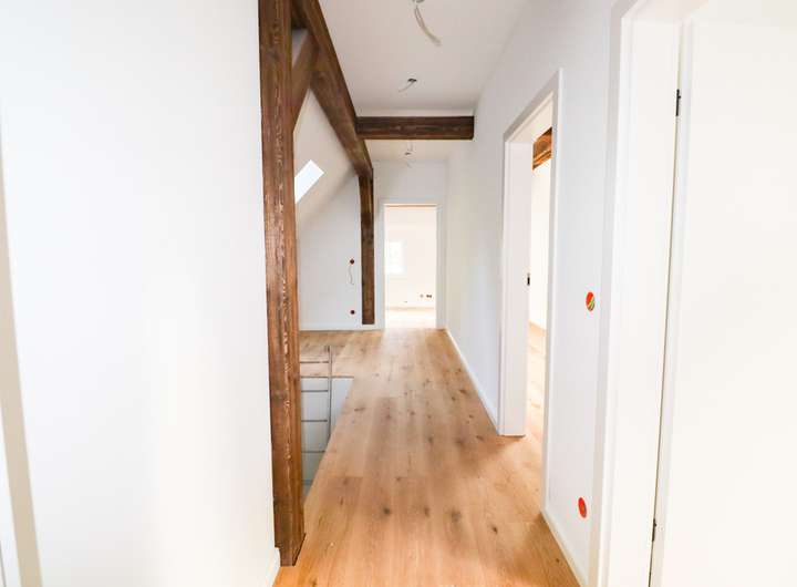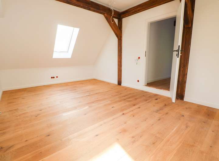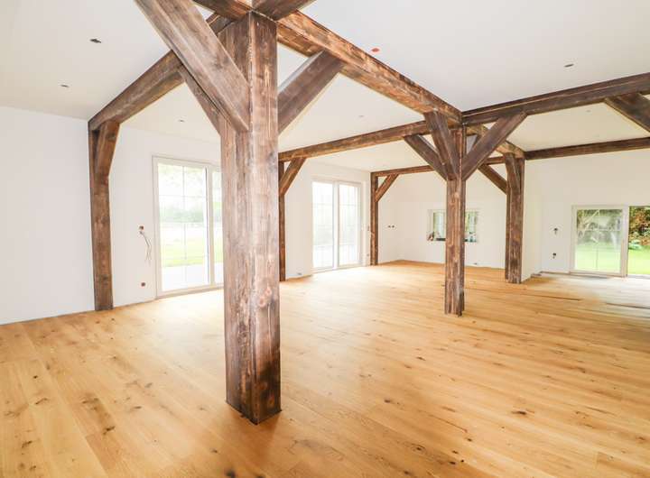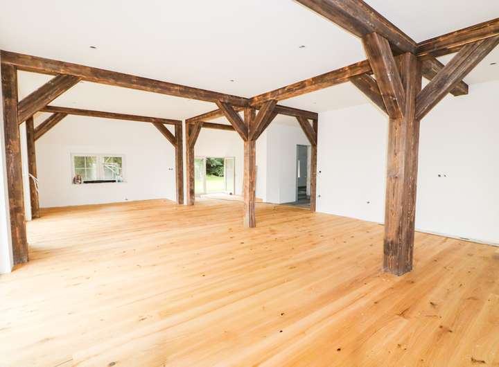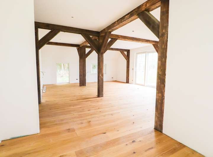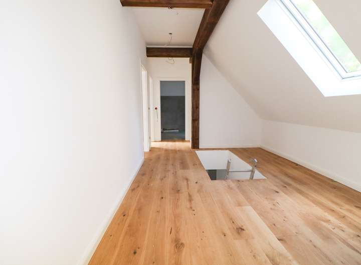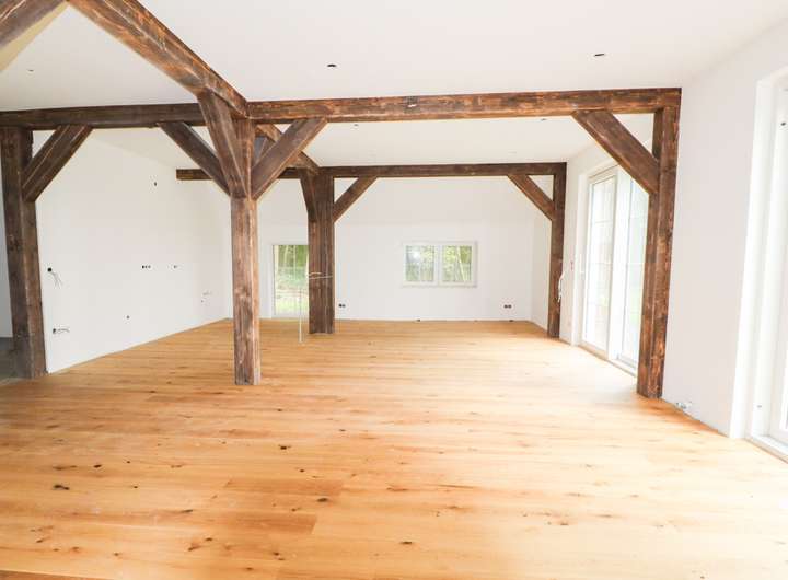 Das Haus verfügt über drei gemütliche Schlafzimmer, zwei moderne Badezimmer mit Dusche und freistehender Badewanne, eine praktische Waschküche sowie einen großzügigen Hauswirtschaftsraum. Der weitläufige Wohn-, Ess- und Kochbereich mit sichtbaren Holzbalken unterstreicht den rustikalen Charakter des Hauses und schafft gleichzeitig eine warme, einladende Wohnatmosphäre. Das ausgebaute Krüppelwalmdach wurde harmonisch in das Wohnkonzept integriert und verleiht dem Innenraum zusätzlichen Charme und Großzügigkeit.