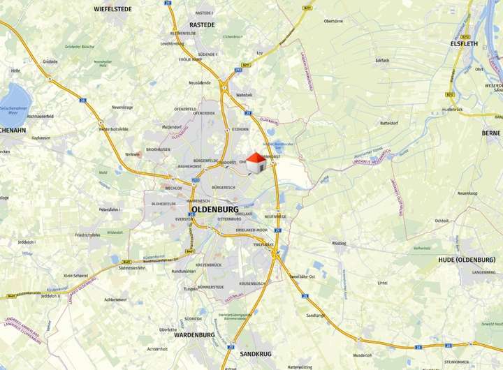 Traumhaft gelegen befindet sich das Grundstück zwischen den Bornhorster-Seen und der Oldenburger Innenstadt. Allerdings ist auf die unmittelbare Nähe des Flyovers (Stadtautobahn) hinzuweisen.