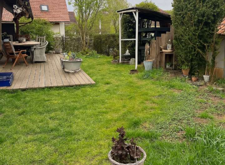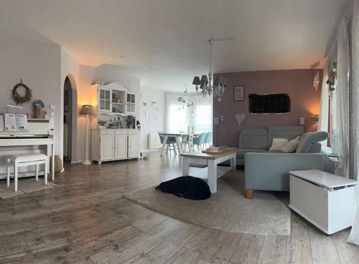 Dieses hochwertig ausgestattete Einfamilienhaus überzeugt durch eine offene Raumgestaltung, einen charmanten Erker und eine großzügige Südwest-Terrasse mit elektrischer SmartHome-Markise. Die ruhige Lage direkt am Feldrand ist ein Paradies für Natur- und Tierliebhaber.