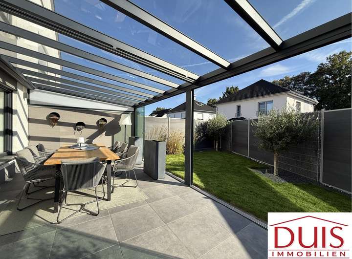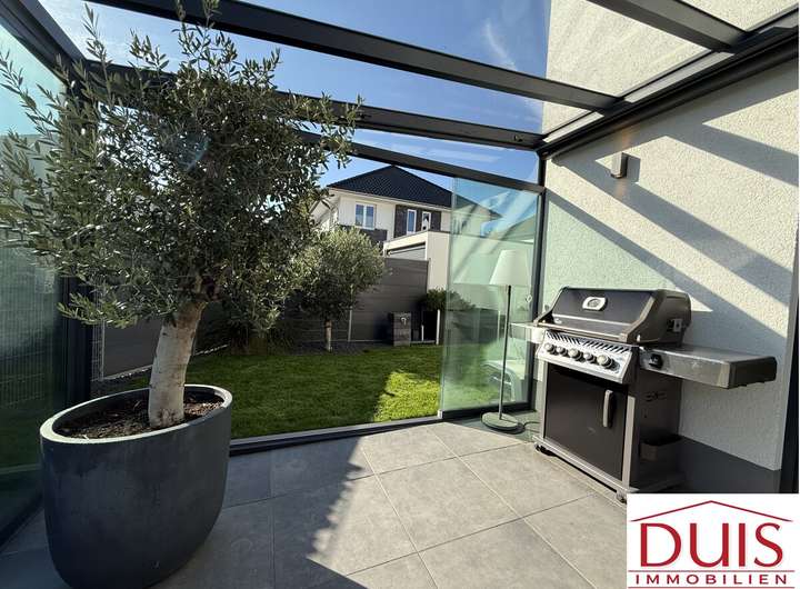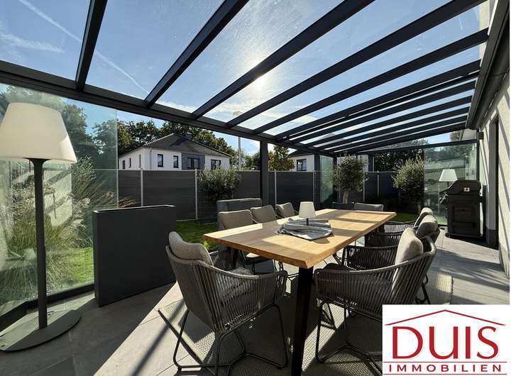 Ein besonderes Highlight ist die überdachte Terrasse mit Glasdach, Schiebetüren und elektrischem Sonnenschutz, die ganzjährig genutzt werden kann. Der liebevoll angelegte Garten verfügt über ein automatisches Bewässerungssystem, gespeist von einem eigenen Brunnen – pflegeleicht und nachhaltig zugleich. Die moderne Haustechnik umfasst unter anderem eine Fußbodenheizung im Erd- und Obergeschoss sowie eine 8 Meter lange Garage mit Wallbox für das komfortable Laden Ihres E-Fahrzeugs.