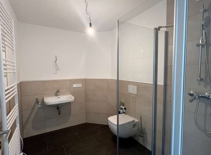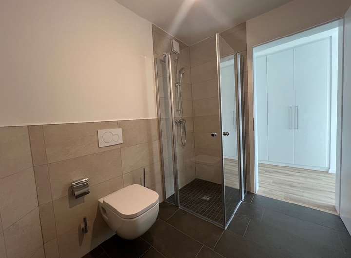 Badezimmer: Edles Feinsteinzeug, große Dusche, Echtglas-Duschabtrennung.