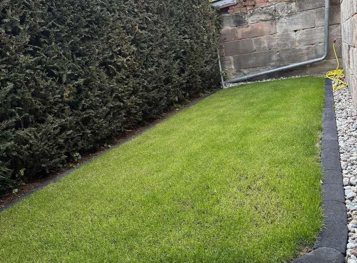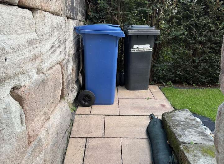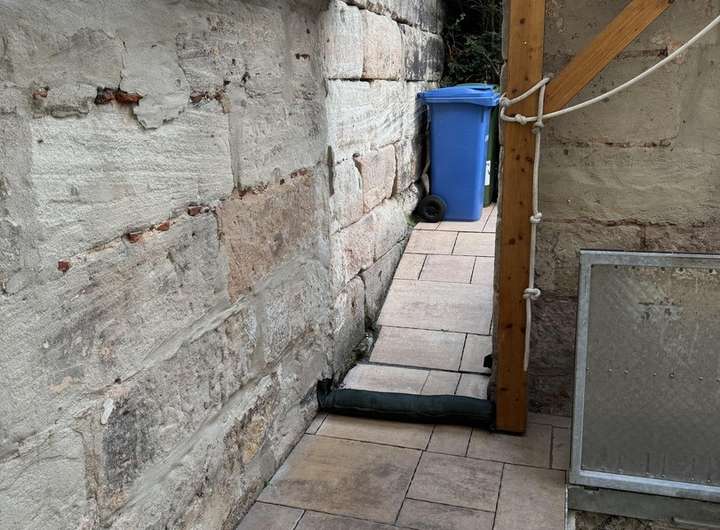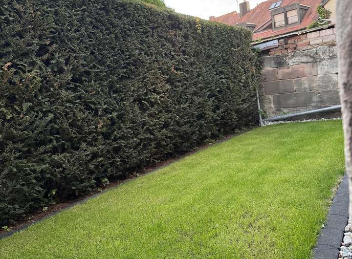 Durch einen Zukauf(2014), gelangen Sie durch eine Öffnung in der Sandsteinmauer in einen kleinen Garten mit einer Hecke als Sichtschutz. Dort stehen auch die Mülltonnen.