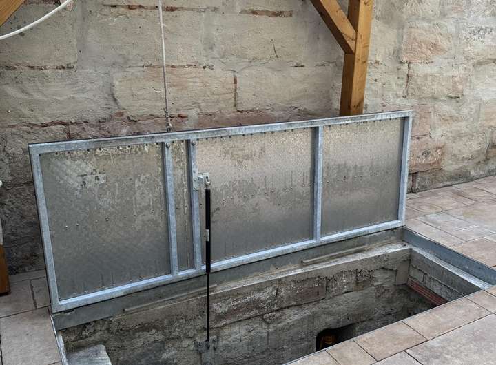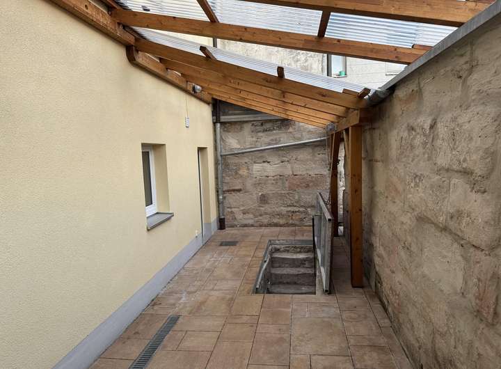 Zurück im Erdgeschoß, gelangen Sie in einen überdachten Hinterhof mit einem kleinen Keller, welcher über eine Falltür zu erreichen ist. Diese können Sie über eine installierte Seilwinde öffnen.