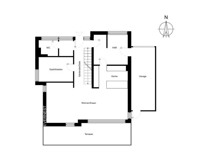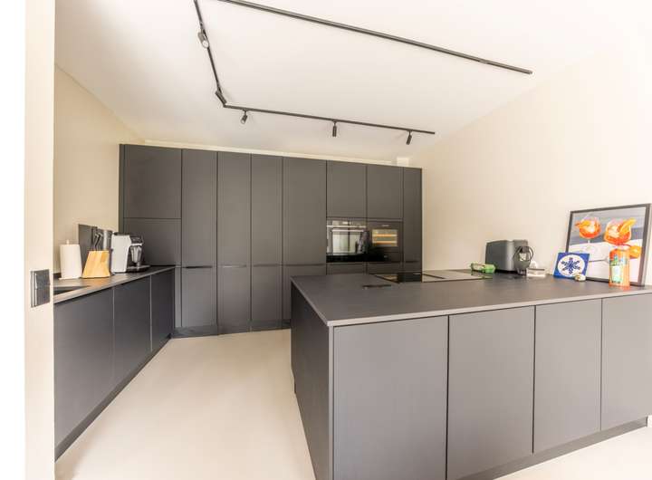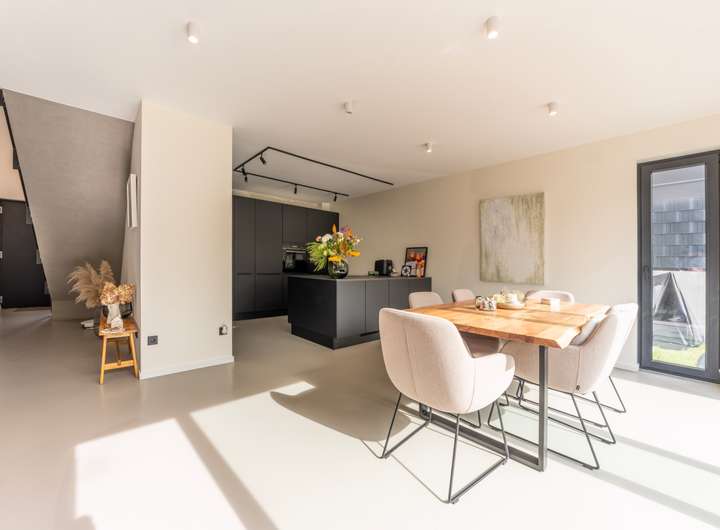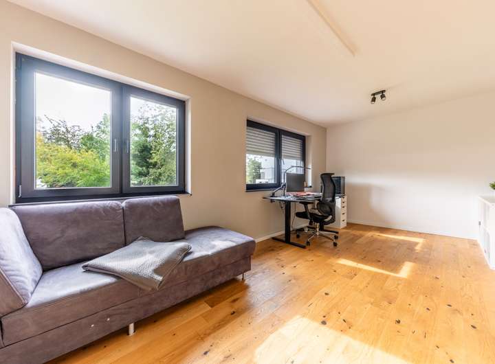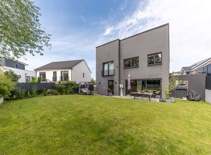 Der Eingangsbereich empfängt Sie mit hohen Decken und einer offenen, einladenden Atmosphäre, die den großzügigen Charakter des Hauses unterstreicht. Von hier aus gelangen Sie direkt in den offenen Wohn- und Essbereich, der das Herzstück des Hauses bildet und mit seinem fließenden Übergang zum Garten, ein ideales Ambiente für gesellige Abende schafft. Die hochwertige Einbauküche ist nicht nur ein optisches Highlight, sondern überzeugt auch mit cleveren Lösungen, wie der versteckten Durchgangstür zum praktischen Hauswirtschaftsraum.