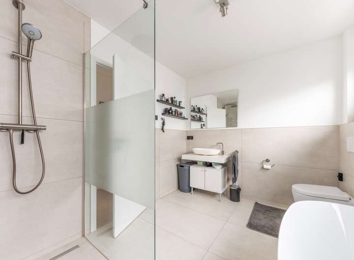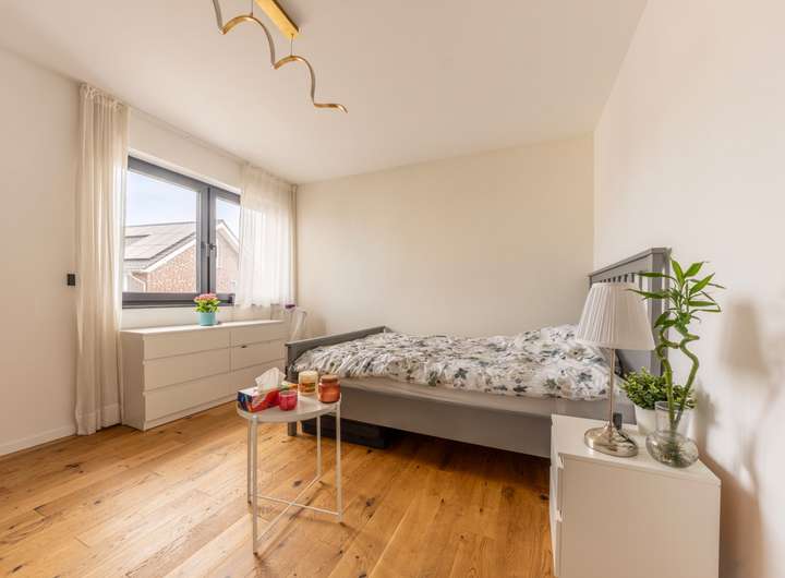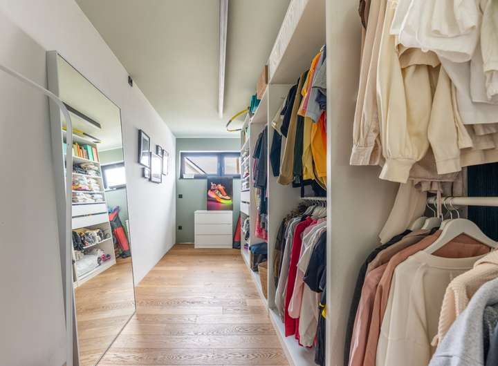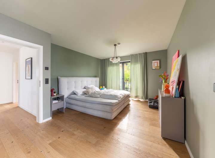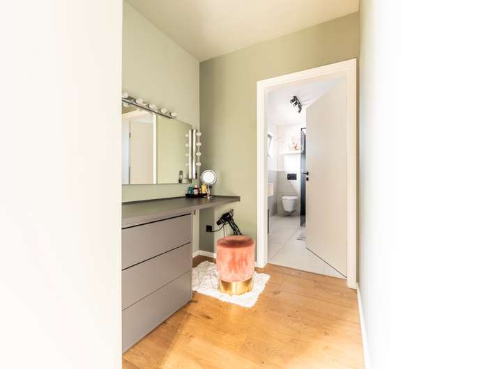 Eines der Schlafzimmer sticht dabei besonders hervor: Ein kleiner, privater Flur führt zu einem eigenen Bad und bietet eine individuelle Nische, die sich perfekt als Schmink- oder Kunstbereich eignet. Ein Highlight ist der direkt angebundene, begehbare Kleiderschrank, der absolute Privatsphäre gewährleistet.