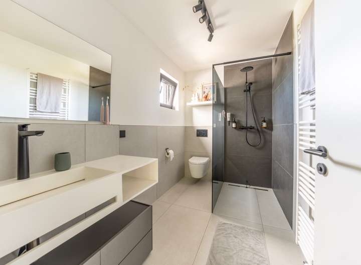 Insgesamt bietet das Haus 5,5 Zimmer, darunter drei geräumige Schlafzimmer und drei elegant ausgestattete Badezimmer.