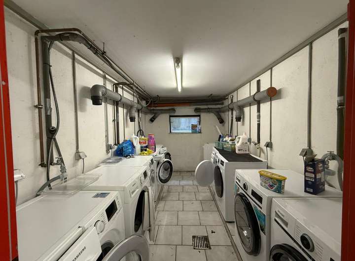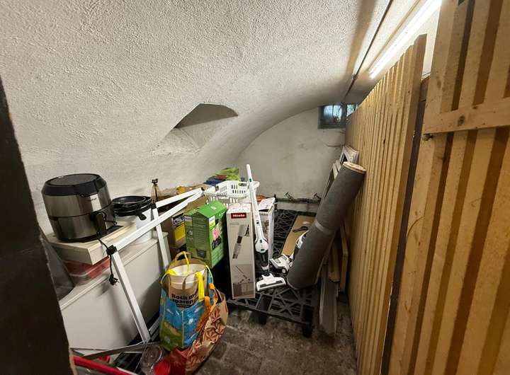Ein separater Kellerraum bietet zusätzlichen Stauraum, während im Untergeschoss ein gemeinschaftlicher Waschraum mit Anschlüssen für Waschmaschinen und Trockner zur Verfügung steht.