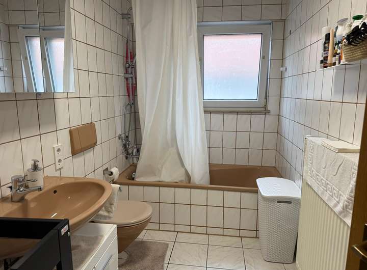 Das Badezimmer ist hell gefliest und verfügt über eine Badewanne, ein Waschbecken und ein WC – gepflegt und funktional gestaltet.