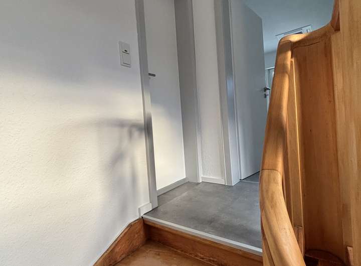 Im Inneren erwarten Sie drei helle Zimmer – ein gemütliches Wohn-/Esszimmer, ein Schlafzimmer und ein weiteres Zimmer, das sich ideal als Büro oder Ankleide eignet. Oben gibt’s außerdem eine kleine Empore, die sich prima als Lese- oder Arbeitsbereich nutzen lässt. Das Bad befindet sich ebenfalls im Obergeschoss. Im Keller stehen Ihnen neben der Waschküche noch zwei Vorratsräume und ein Technikraum zur Verfügung – praktisch und ordentlich gelöst.