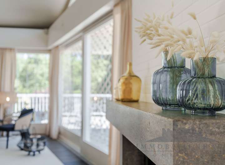 Der repräsentative Wohnbereich erstreckt sich über mehr als 75 m² und beeindruckt mit einer offenen Wohnhalle, die sich bis zum Spitzdach öffnet und eine Deckenhöhe von bis zu fünf Metern erreicht. Großzügige Fensterfronten durchfluten den Raum mit natürlichem Licht und unterstreichen das großzügige Raumgefühl. Ein offener Kamin sorgt für Gemütlichkeit. Der rund 100 m² große Balkon ist vom Wohn- und Esszimmer aus erreichbar und mit einer offenen Feuerstelle versehen, perfekt für gesellige Abende im Freien. Hier gelangen Sie in den wunderschönen Garten, der mit einem Pool ausgestattet ist.