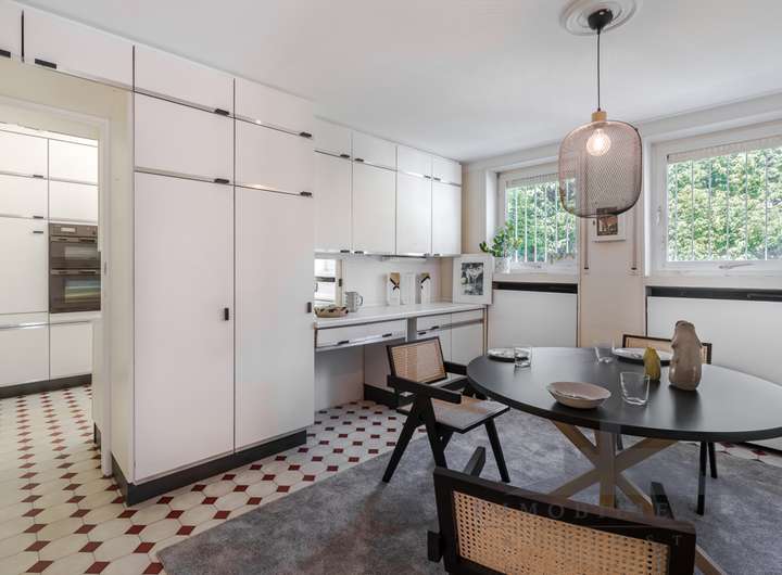 Das in massiver Bauweise konstruierte Einfamilienhaus wurde 1965 erbaut und 1977 durch eine Einliegerwohnung mit Zugang zum Garten und separatem Eingang auf über 400 m² Wohnfläche erweitert.
