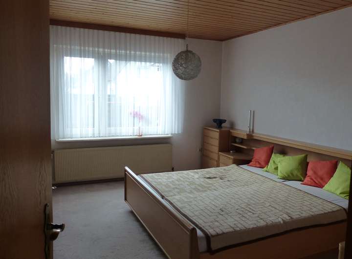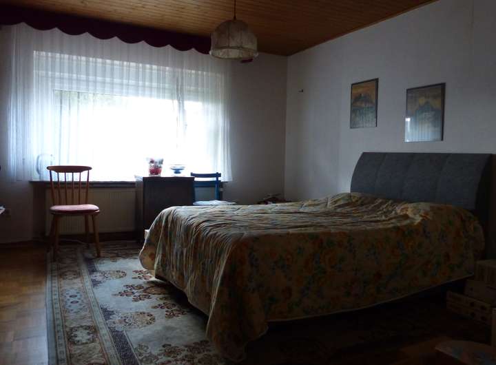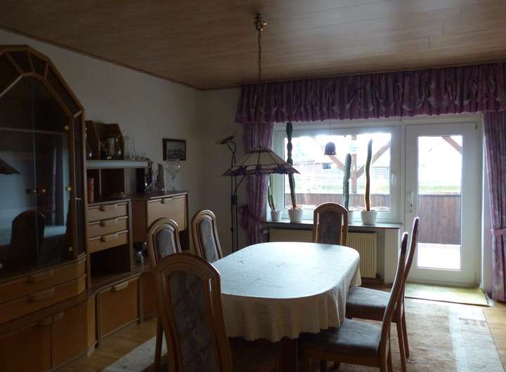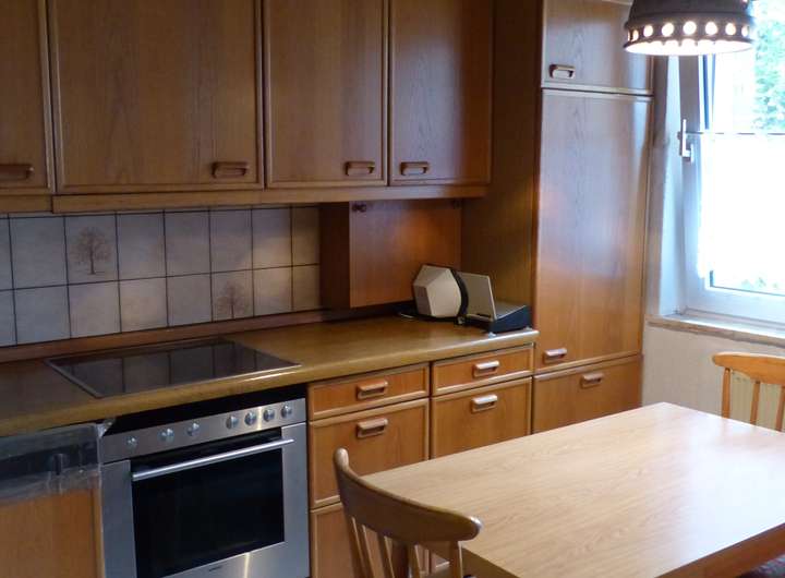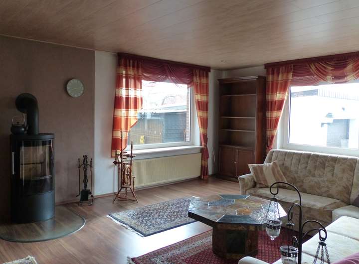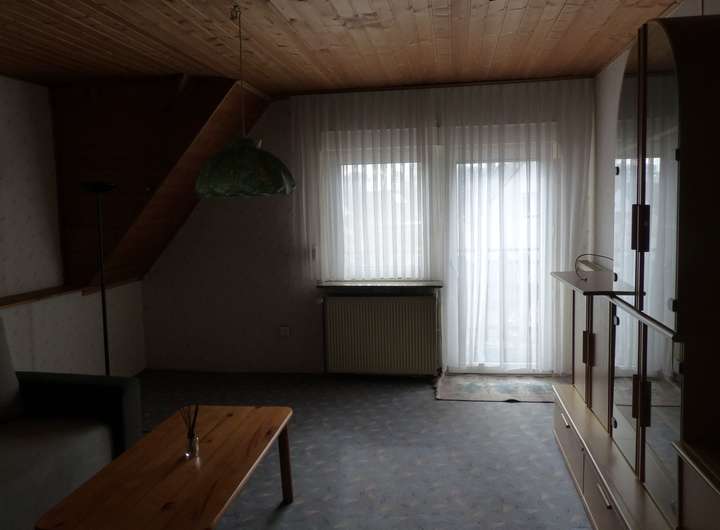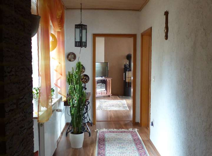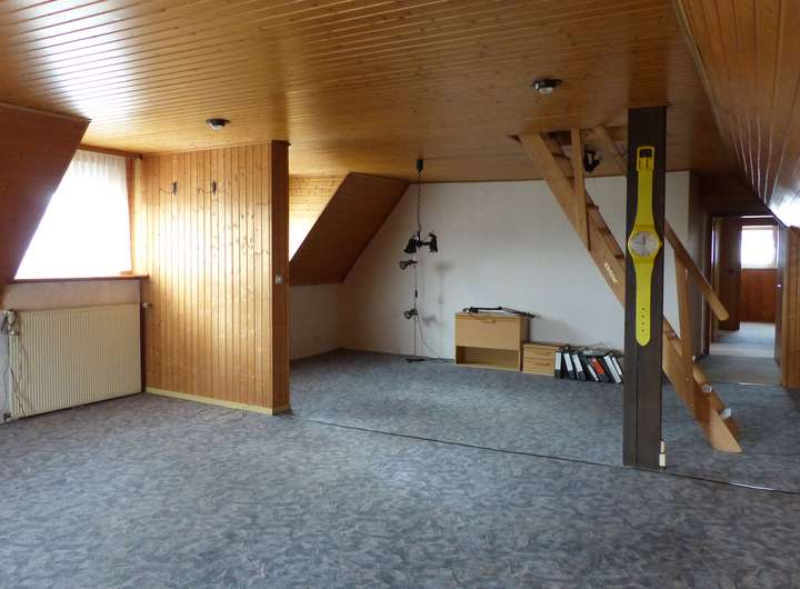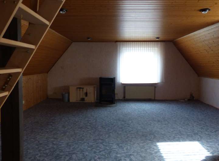 Die obere Wohnung verfügt neben Küche, Bad, Schlaf- und Kinderzimmer über ein sehr großzügiges Wohnzimmer, ebenfalls mit Kaminofen ausgestattet. Von hier gelangt man über eine Raumspartreppe auf den teilausgebauten Dachboden. Der ausgebaute Teil des Dachbodens kann gut als Büro oder Hobbyraum genutzt werden. Der übrige Teil des Dachbodens ist Staufläche und zusätzlich über eine klappbare Bodentreppe im Flur erreichbar. Die Wohnung verfügt über einen kleinen Balkon.