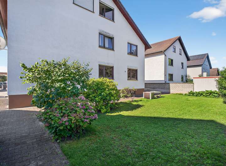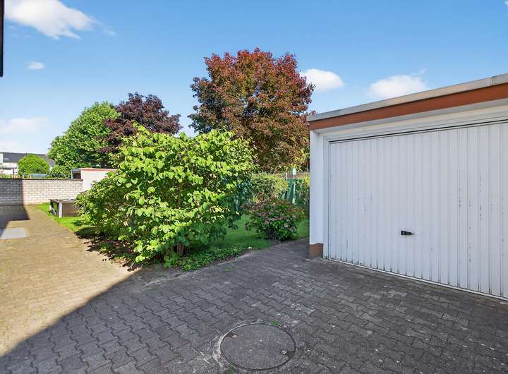 Zur Wohnung gehören außerdem ein eigenes Kellerabteil sowie eine Garage auf der rechten Hausseite. Das 571 m² große Grundstück umfasst neben dem Haus auch drei Garagen, eine Hofeinfahrt und den gepflegten Gemeinschaftsgarten.
