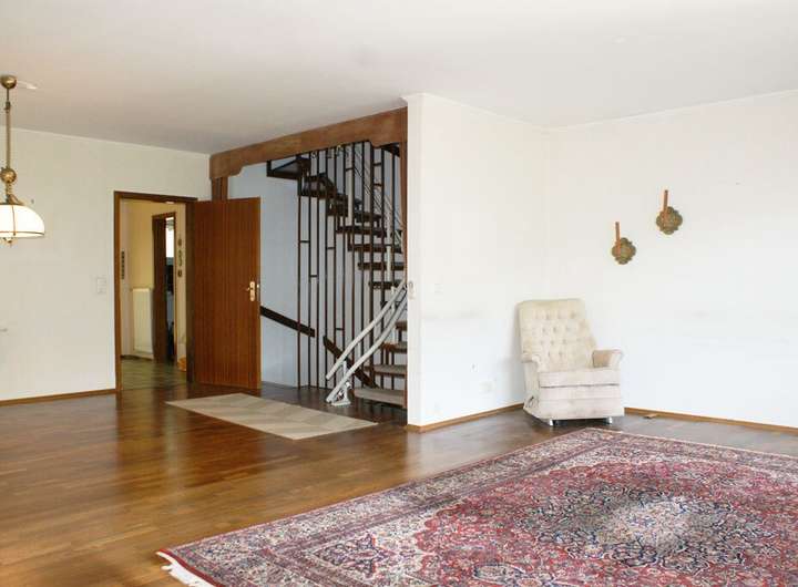 Das Wohnzimmer ist riesig. Es bietet viel Platz für einen großen Essbereich und für eine ausgiebige Wohnlandschaft. Über die große Fensterfront mit Terrassentür betritt man die breite und tiefe Terrasse, mit großzügigem Platz für einen großen Tisch und Grill. Die Südwest-Ausrichtung garantiert wunderbare und sonnenverwöhnte Sommerabende. Das Wohnzimmer ist der zentrale Punkt des Hauses. Von hier führt die offene Treppe in die anderen Stockwerke. Einfach perfekt für das Familienleben.