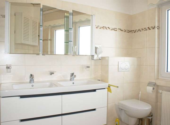 Im Obergeschoss liegt das große Elternschlafzimmer, ein Schlafzimmer mit Balkon und ein weiteres Schlafzimmer. Natürlich befindet sich auch in dieser Etage ein Tageslichtbad mit bodengleicher Dusche, Badewanne, Doppelwaschbecken, WC und Bidet. Das Badezimmer wurde erst vor ein paar Jahren komplett modernisiert.