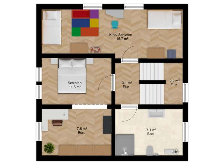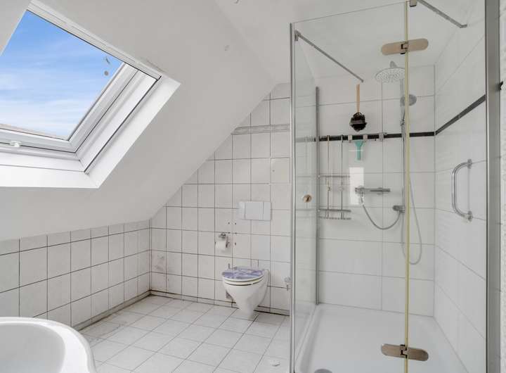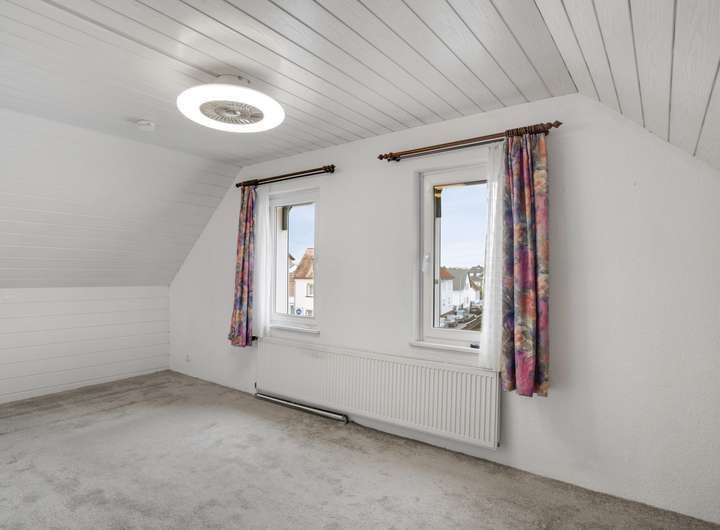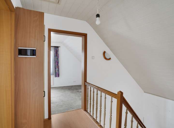 Über den Flur geht es weiter ins Obergeschoss. Die Treppe wurde in 2006 fachmännisch aufgearbeitet. Im oberen Bereich befindet sich ein 17 qm großes Schlafzimmer und ein weiteres Zimmer, welches Zugang zu einem weiteren Zimmer gewährt. Über den Flur gelangt man ebenfalls in das weitere, moderne Bad sowie über eine Dachbodenklapptreppe auf den gedämmten Spitzboden.