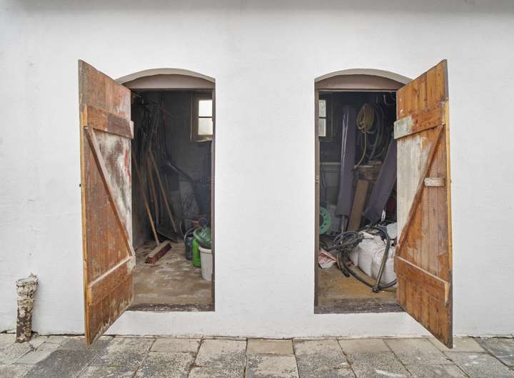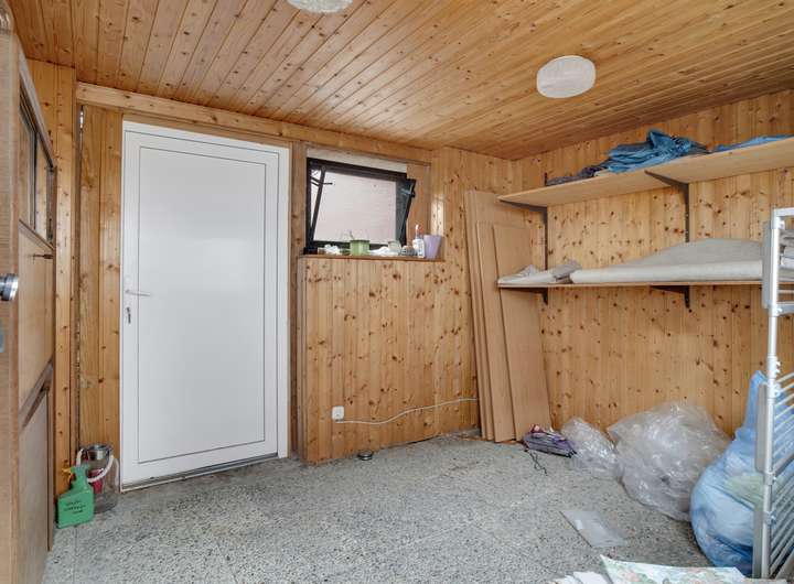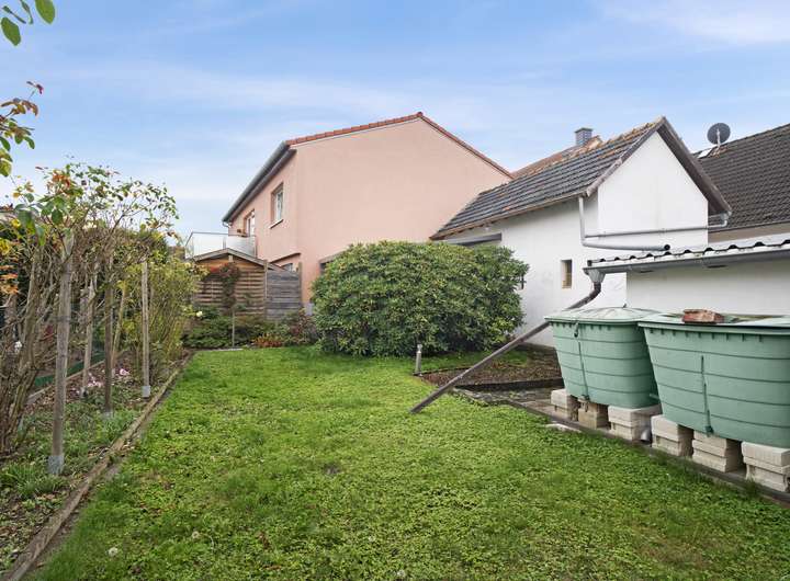 Der vordere Außenbereich ist mittlerweile etwas in die Jahre gekommen, eignet sich jedoch gut zum Sitzen und Fußball spielen mit den Kindern. Hier befindet sich auch die geräumige Garage. Am Haus angrenzend ist auch der Brunnenzugang mit Tauchpumpe. Der hintere Bereich des Grundstücks ist durch einen großen Schuppen mit Durchgang zum grünen Garten und zur Terrasse abgegrenzt. Die Schuppenzimmer bieten viel Stauraum für Geräte und auch als Partyfläche bei Regen. Der Garten präsentiert sich gepflegt und grün. Die schattige Terrasse lädt ein die Sommerabende beim Grillen zu genießen umgeben von bunten Rosen und Oleander.