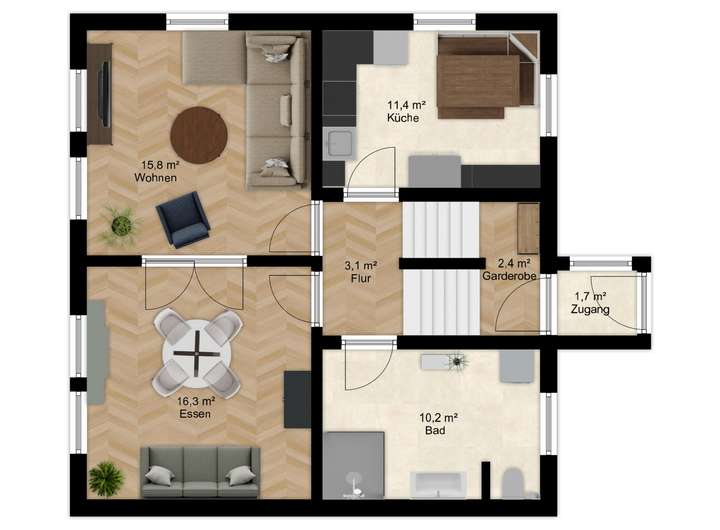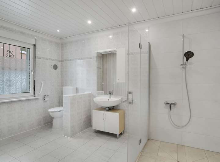 Über einen Vorraum gelangen Sie trocken in den Eingangsbereich mit Garderobe. Hier befindet sich auch der Zugang zum Keller mit 3 Hobby-/Lagerräumen und einem Heizraum. Gerade aus weiter geht es mit ein paar Stufen in einen weiteren Flurbereich, welcher Zugang zum Wohn- und Esszimmer bietet sowie Zugang zur gemütlichen Wohnküche und zum barrierefreien Bad. Die Zimmer sind mit jeweils 2 Fenstern recht hell und haben eine Größe von ca. 16 qm.