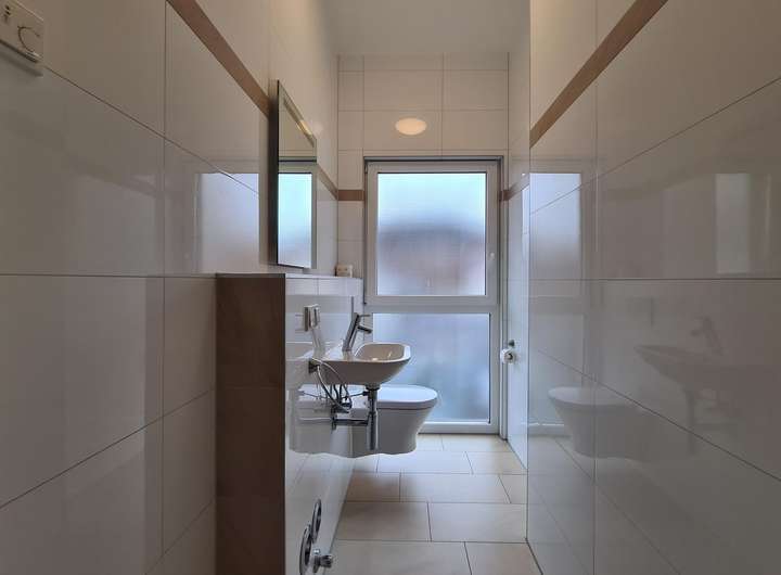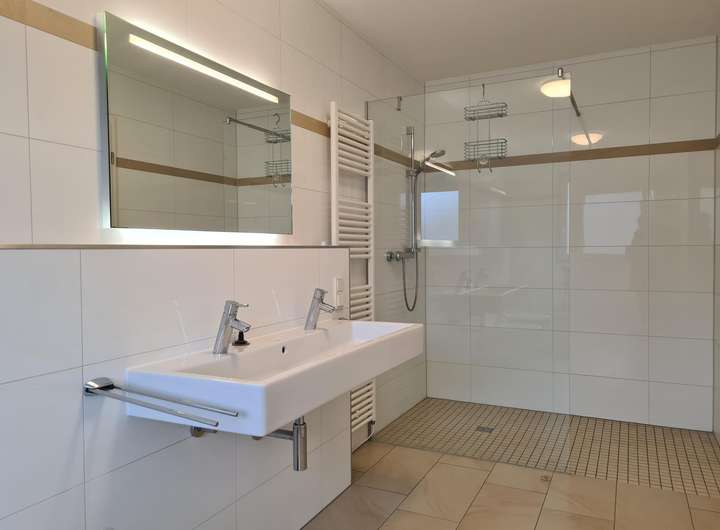 Auch Bad und Gäste-WC verfügen über eine hochwertige Ausstattung; so ist die Badewanne aus Acryl, die bodengleiche Dusche ist mit Echtglas abgetrennt, die Waschtische sind von V&B, die Armaturen sind von Hansgrohe.