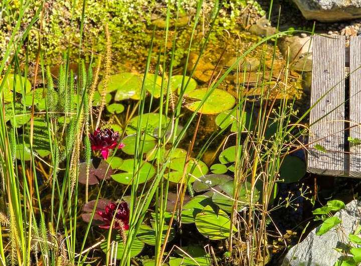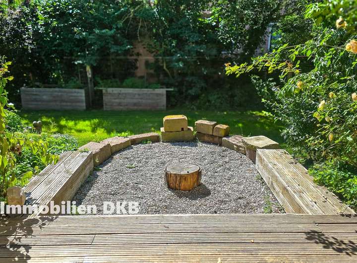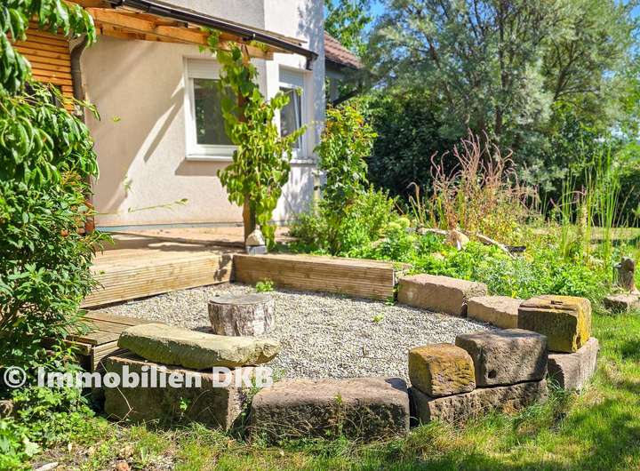 uneinsehbarer Garten mit Obstbäumen, Hochbeeten, Feuerstelle, Teich und
