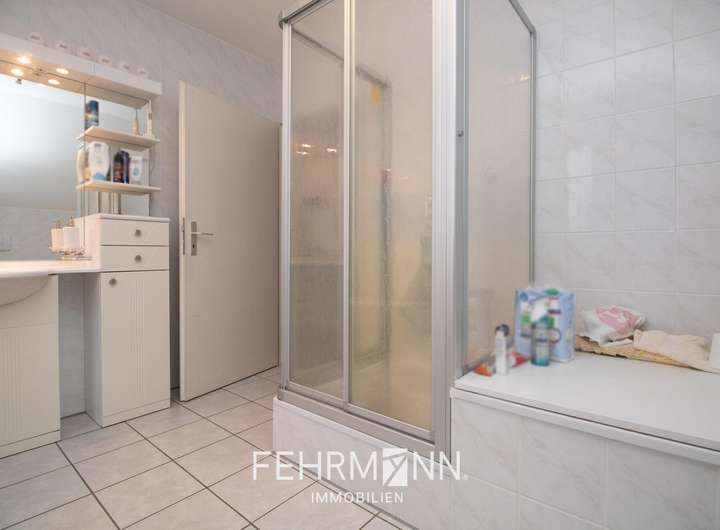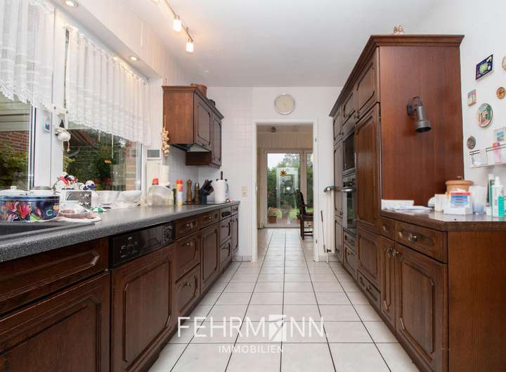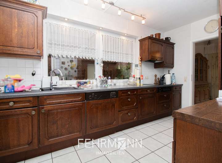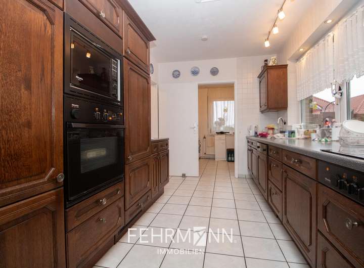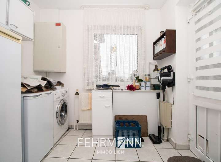 Die Ausstattung umfasst eine funktionale Einbauküche mit Einbauschränken, die Ihnen direkt bereitsteht. Ein angrenzender Hauswirtschaftsraum ermöglicht weiteren Stauraum für Haushaltsgeräte und Vorräte. Ein Anschluss für eine Waschmaschine und einen Trockner ist vorhanden.