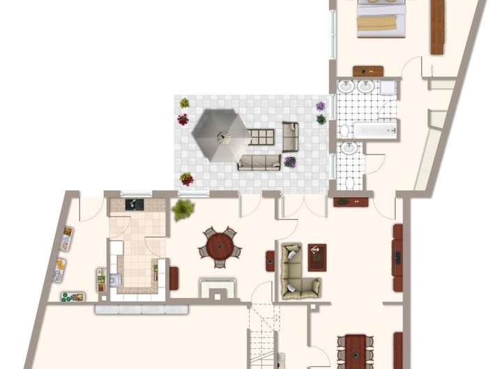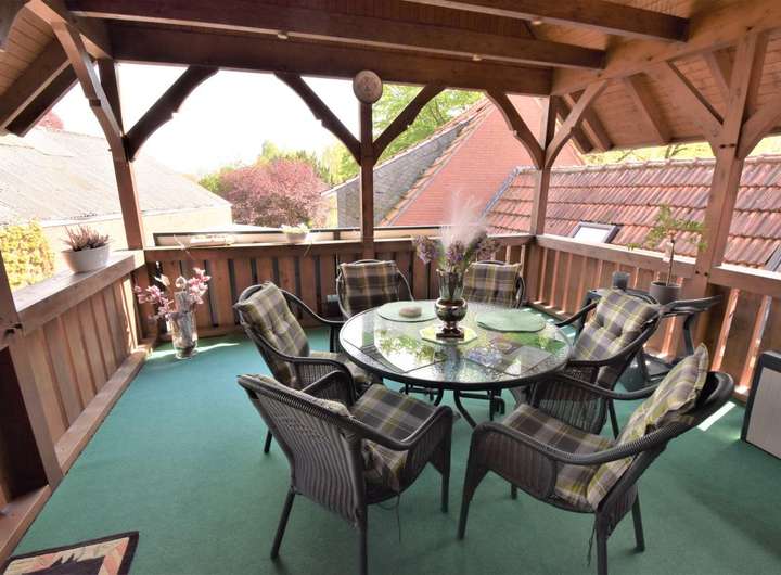 - Großzügige Außenfläche: Über 2.000 m² Grundstück mit einer geschützten Terrasse und einem imposanten bayrischen Balkon.