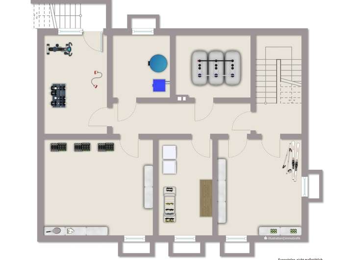 Das Kellergeschoss bietet viel Stauraum und klare Struktur: Eine Waschküche, ein Hobbyraum, ein weiterer Kellerraum für Werkbank/DIY, dazu Heiz- und Ölraum für die bestehende Ölzentralheizung. Hier findet alles seinen Platz – vom Vorrat bis zur Werkbank.