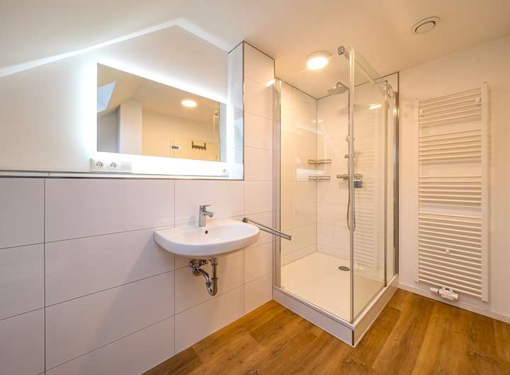 Sanitär: EG: Innenliegendes Bad mit eingemauerter Dusche mit Glasduschabtrennung, Waschtisch, wandhängender WC-Anlage und Handtuchheizkörper, DG: Tageslichtbad mit Dusche, Waschbecken, wandhängender WC-Anlage und Handtuchheizkörper