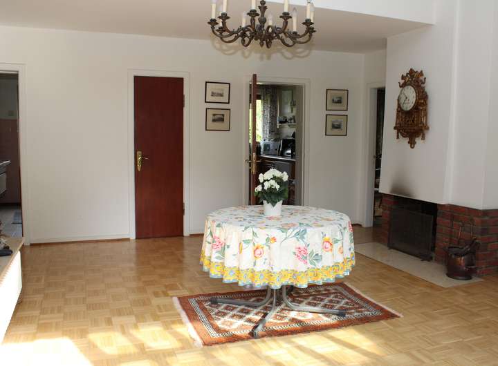 Der offene Dielenbereich mit dem Kamin ist sehr großzügig und repräsentativ. In allen Räumen im Erdgeschoss befindet sich Stäbchen Parkett.