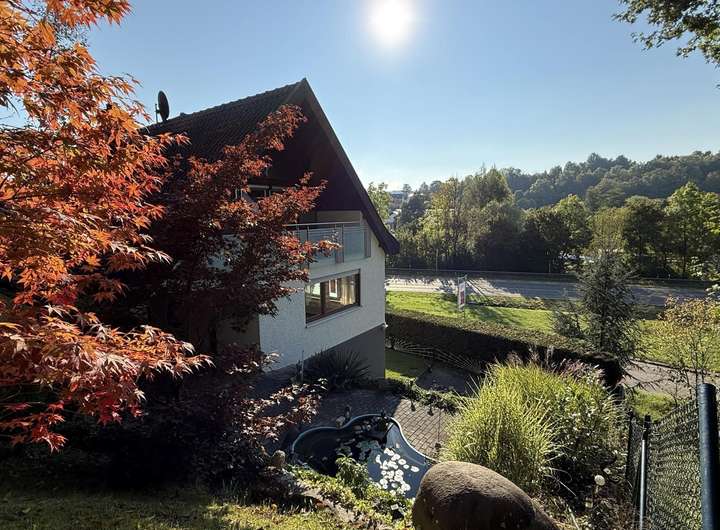 Ergänzt wird das Gebäude durch einen großen Carport, einen umliegenden Garten, eine Terrasse mit Fischteich und die darunterliegende Rasenfläche.