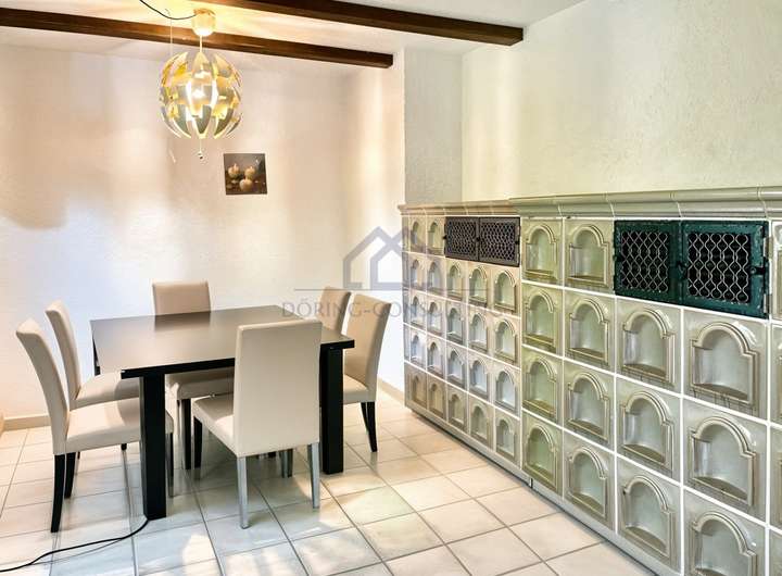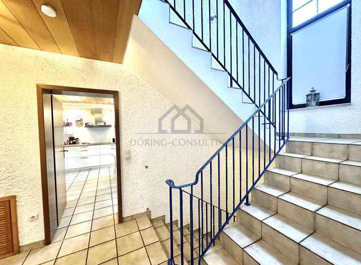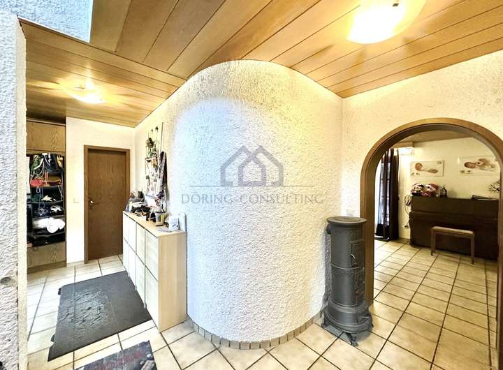 Beim Betreten der des Hauses, gelangen Sie zunächst in den geräumigen Dielenbereich. Hier haben Sie ausreichend Platz für Ihre Garderobe. Linkerhand befindet sich das Gäste-WC. Der großzügige Wohnbereich wird durch die großen Fensterflächen mit ausreichend Licht durchflutet. Angrenzend befindet sich der offene Essbereich. Der Kamin wurde 2017 erneuert und lädt zu gemütlichen Stunden ein. Die Einbauküche ist mit allen notwendigen Elektrogeräten der Marke Siemens ausgestattet.