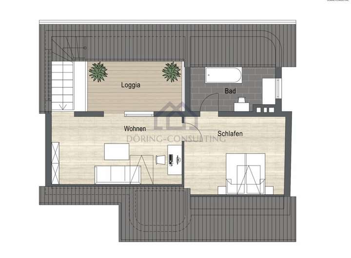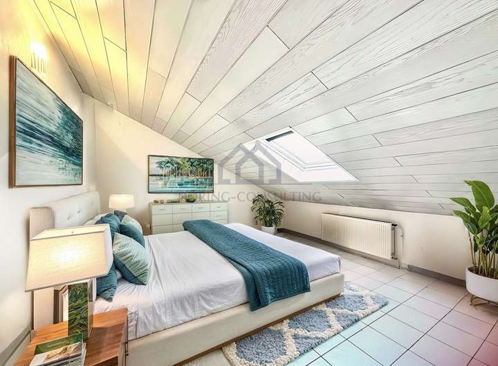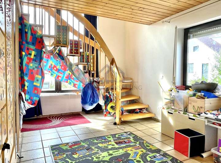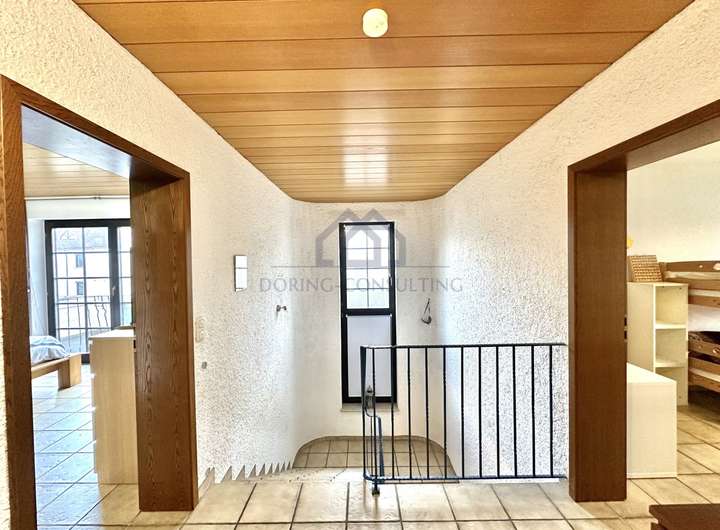 Über die Wendeltreppe betreten Sie einen weiteren Wohnbereich mit zwei Zimmern. Von hier aus gelangen Sie auch auf die Loggia. Ein zusätzlich angrenzendes Zimmer ist perfekt als Schlafzimmer geeignet. Auch auf dieser Etage befindet sich ein weiteres Tageslichtbad mit Badewanne.