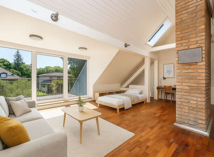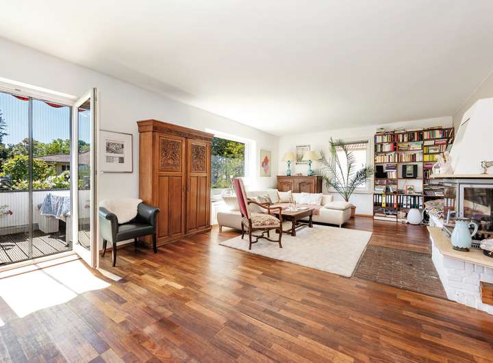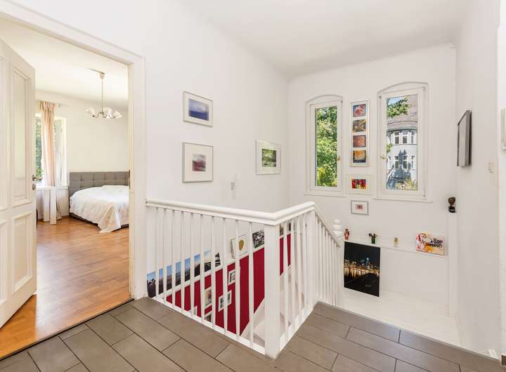 Insgesamt stehen sieben Zimmer zur Verfügung, die vielfältige Wohn- und Arbeitskonzepte ermöglichen. Ergänzend zu den zwei offiziell genehmigten Wohneinheiten verfügt das Haus über weitere, wohnlich ausgebaute Nutzflächen. So befindet sich im Souterrain ein eigenständig zugänglicher Bereich mit Schlafraum, Küche und Bad, der flexibel als Gäste-, Arbeits- oder Hobbybereich genutzt werden kann. Auch der Dachboden umfasst wohnlich ausgebaute Nutzfläche mit einem Südbalkon, die zusätzliche Gestaltungsoptionen eröffnet.