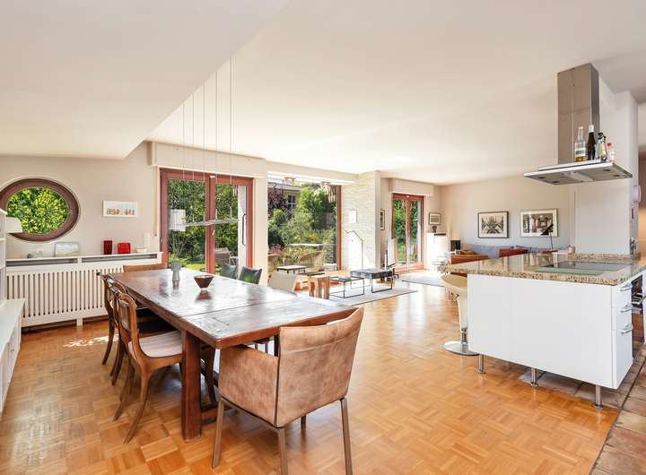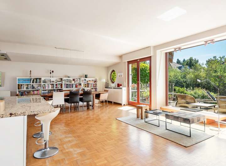 Das Herzstück des Hauses bildet die eindrucksvolle Wohnküche mit einer Fläche von etwa 60 Quadratmetern. Großzügige Panoramafenster lassen viel Licht herein und schaffen eine offene, freundliche Atmosphäre. Von hier aus öffnet sich der direkte Zugang zur sonnigen Südterrasse, die nahtlos in den Garten übergeht und ideale Voraussetzungen für entspannte Stunden im Freien bietet.