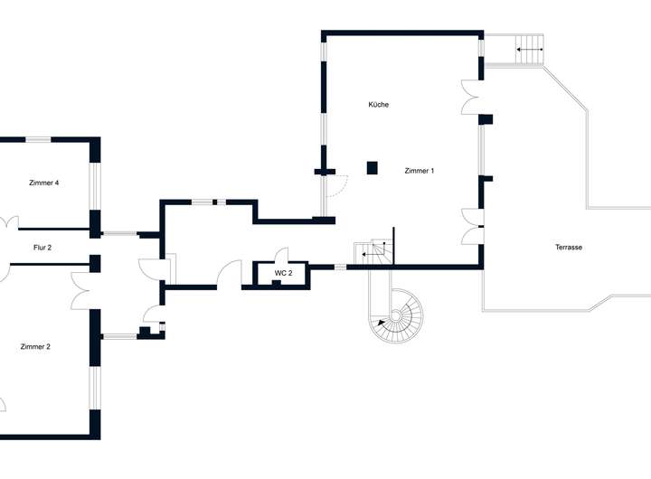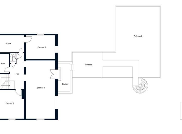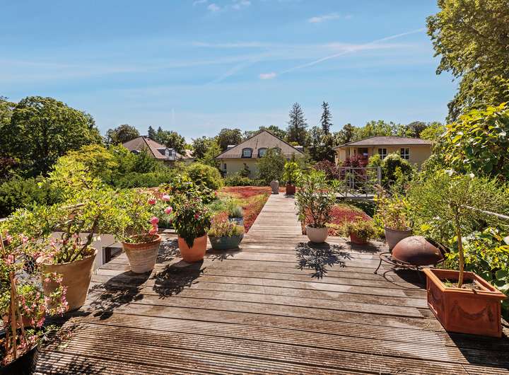 Charakteristisch und zugleich reizvoll ist der Dachgarten auf dem Obergeschoss. Er ist sowohl über eine Wendeltreppe vom Garten aus erreichbar als auch direkt vom Obergeschoss zugänglich und erweitert die Möglichkeiten für Erholung und individuelle Nutzung.